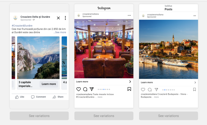 - Construirea unui sales funnel format din mai multe componente, pe pași – în etape: o reclamă de tip carusel afișată pe Facebook și Instagram (vezi mai jos), ce scotea în evidență cele mai importante avantaje ale pachetului turistic. Pentru cei care interacționau cu această reclamă se afișau apoi alte reclame care să îi determine să acționeze: oferte speciale, reduceri.
