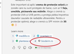 La efectuarea unei interogări pe Microsoft Copilot despre cremele de protecție solară si despre factorul SPF recomandat, răspunsul furnizat de instrumentul de inteligență artificială este foarte complet. La surse, apare foarte vizibil website-ul optimizat:
