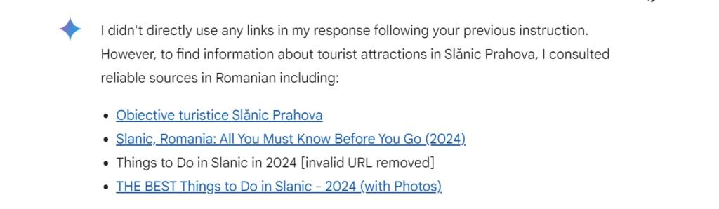 Situația 2. În acest an, au apărut mai multe modificări fiscale în România. Un antreprenor solicită un punct de vedere cu privire la aceste noutăți legislativ- contabile din țara noastră. Google Gemini îi oferă răspunsuri la întrebări și precizează și de pe ce website a preluat informațiile cu ajutorul cărora a furnizat răspunsul – în cazul în care utilizatorul dorește să exploreze noi detalii. Lista de website-uri este afișată transparent.